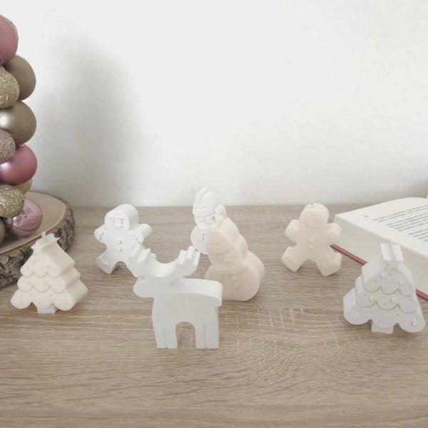 handgemachte Weihnachtskerzen und Keramik-Deko mit Motiven wie Lebkuchenmann, Schneemann, Elch und Tannenbaum – perfekte Geschenke für die Festtage