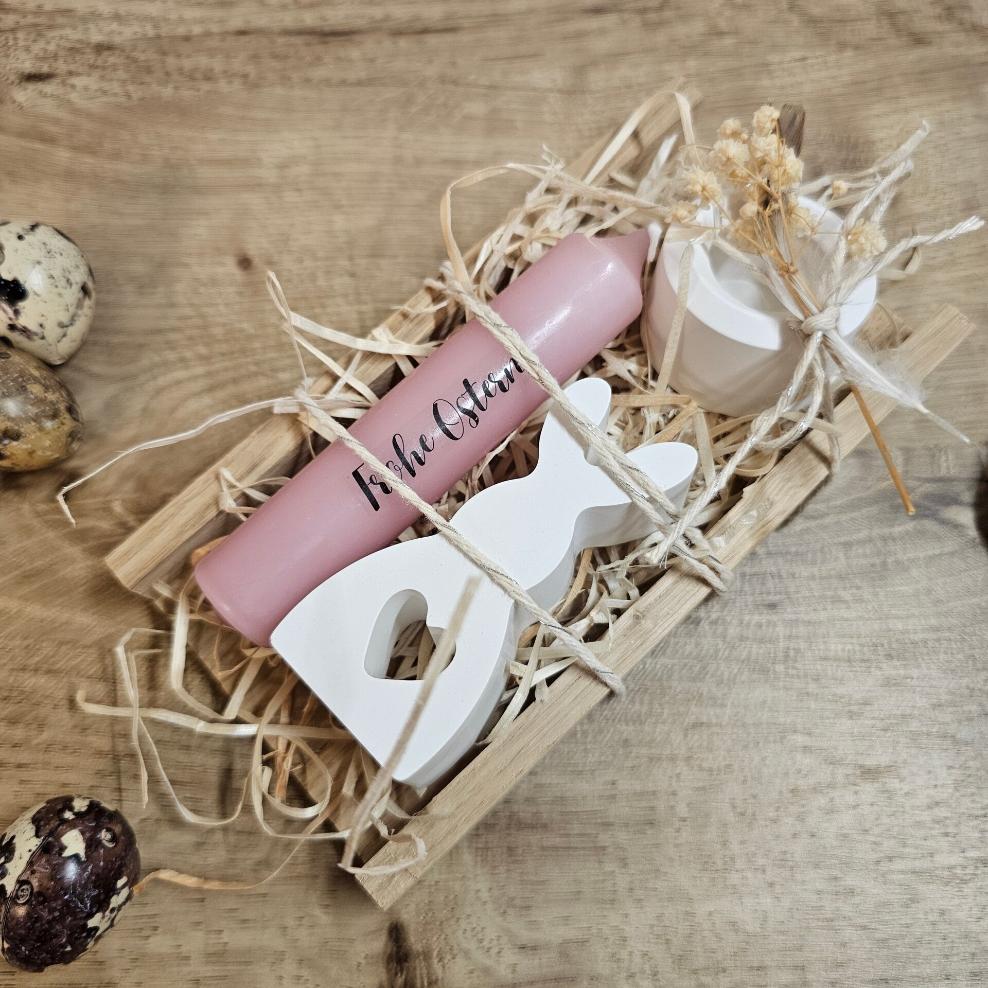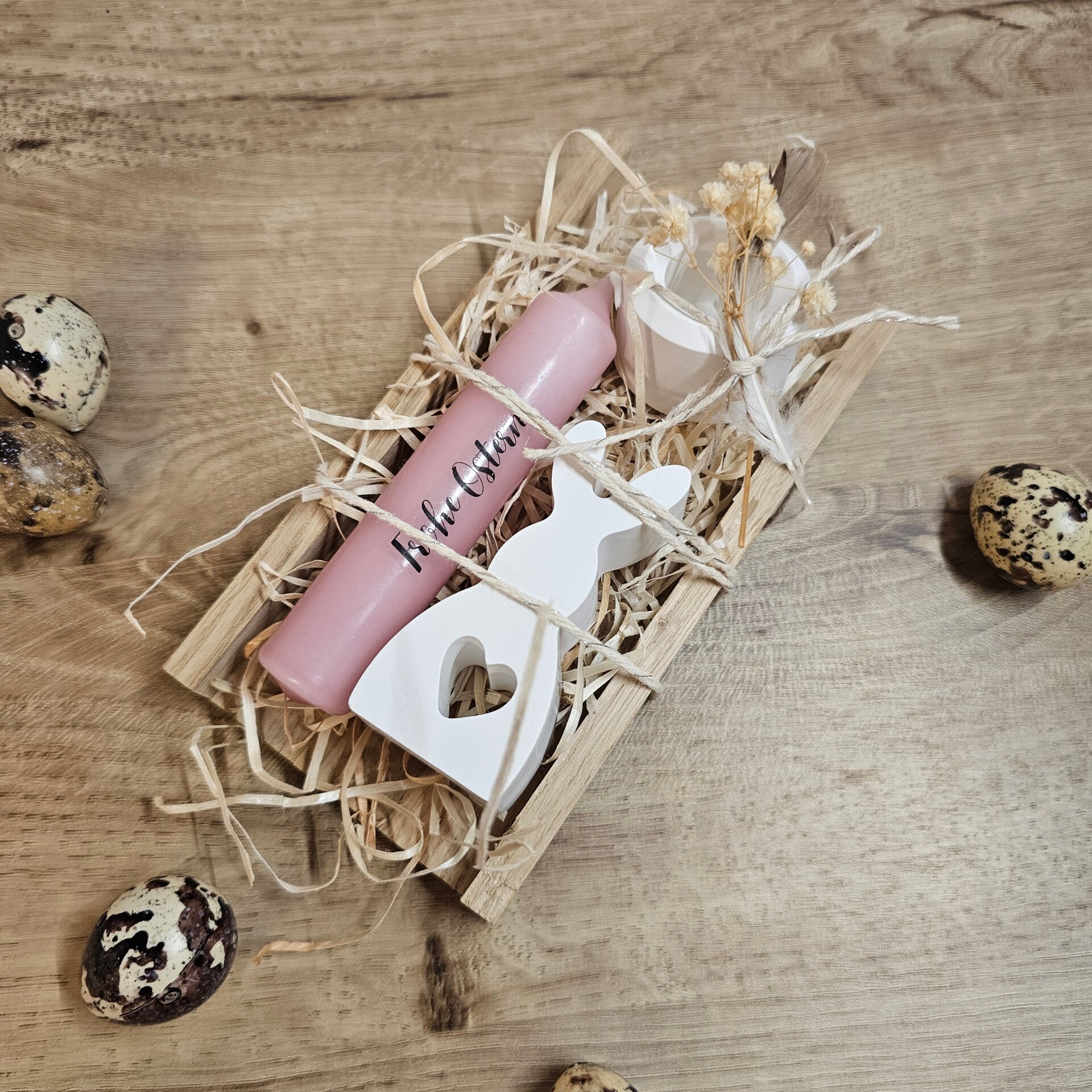 📏 Produktmaße: Holzkiste 16 cm x 8,5 cm x 2,5 cm, kl. Hase 7,5 cm x 3,5 cm x 2 cm , Stabkerzenhalter 2,5 cm x 4 cm