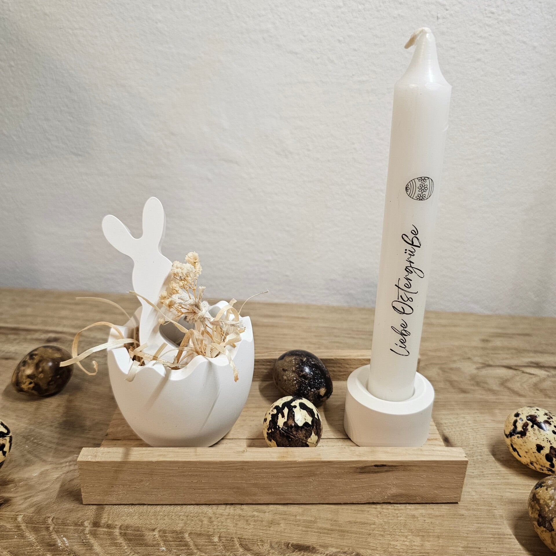 Holzset mit Eierschale, kl. Keramikhase und Kerze