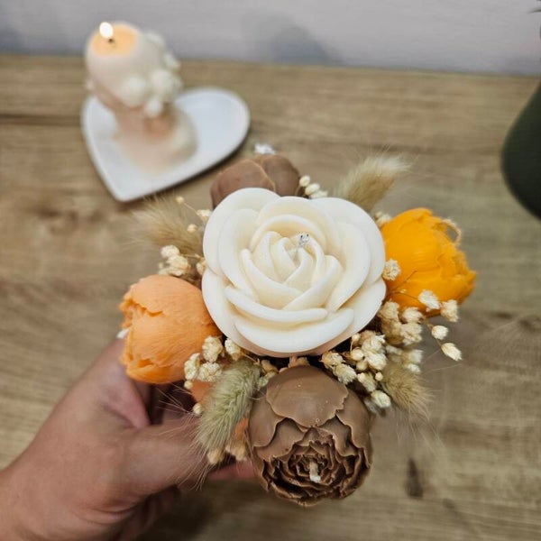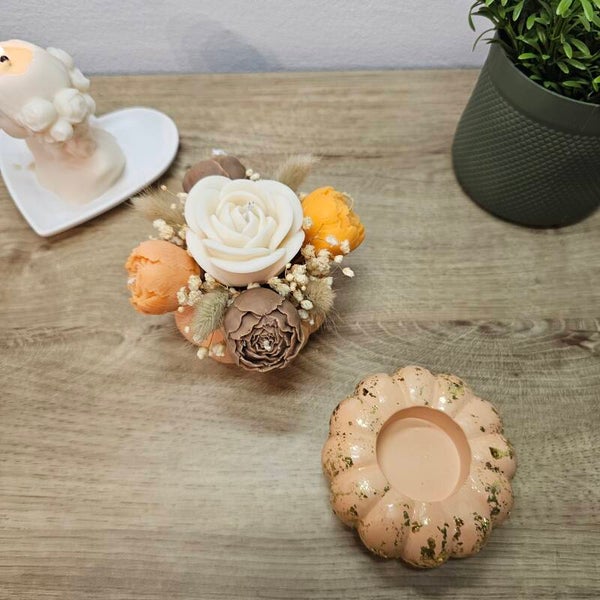 Kürbispoesie - Kerzenblumenstrauß im Kürbisteelichthalter